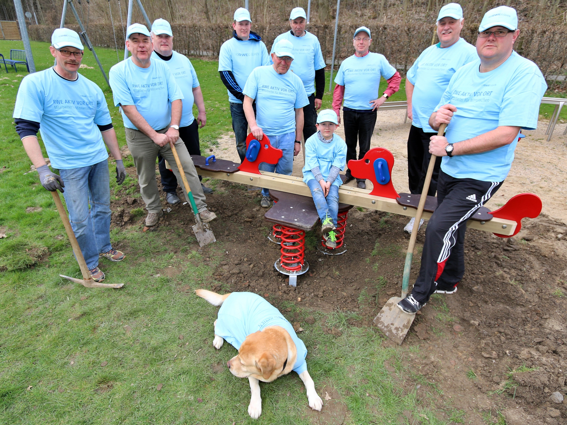 Die Montage der drei Spielgeräte erfolgte auf der Grünfläche im hinteren Bereich des Freibades durch ehrenamtlichen Helfer. RWE-Vertreter Klaus Mußhoff, selbst Wickeder Bürger, packte dabei ebenso mit an wie Ralf Hettwer und Werner Mischke vom Vorstand des Freibad-Fördervereins. Aber auch Schwimmmeister Michael Scheffler und Siegfried Gebhardt vom kommunalen Bauhof opferten einige Freizeitstunden, um die Geräte aufzustellen. Zusammen mit weiteren ehrenamtlichen Helfern waren die Geräte dann auch schnell in tiefen Erdlöchern verankert.