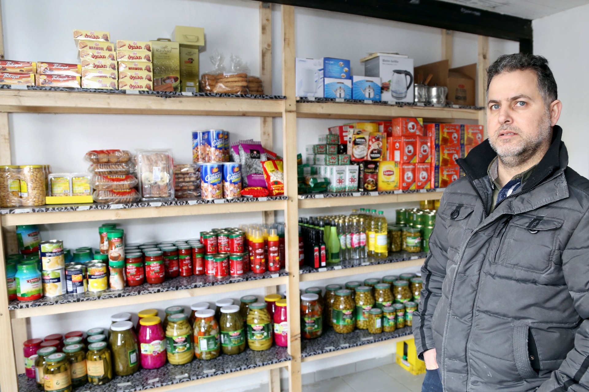 Das dicht gepackte Sortiment in den einfachen Holzregalen reicht von arabischem Kaffee und Tee über abgepackte Fladenbrote und getrocknete Kichererbsen bis hin zu frischem Obst und Gemüse. Aber auch Konserven und Gläser sowie Wasserpfeifen stehen zum Verkauf.