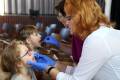 Gespannt, was sich in dem „Karies-Tunnel“ befindet, lassen sie sich geduldig ihre Zähne mit einer fluoreszierenden Flüssigkeit von Annette Mend und Martina König bestreichen. Danach dürfen die Kinder hinter den schwarzen Vorhang treten. Der Tunnel ist mit Schwarzlicht beleuchtet und weckt sichtlich das Interesse der kleinen Besucher.