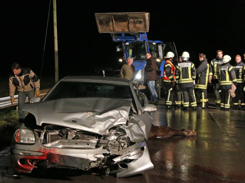 Zwei leicht verletzte Fahrzeugführer, zwei verendete Pferde und zwei Pkw mit Totalschaden. So lautet die erste Bilanz eines schweren Verkehrsunfalls auf der Kreisstraße 21 an der Ortsgrenze zwischen Wimbern und Oesbern.